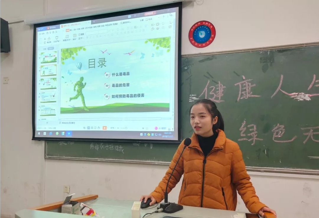 各班班长通过讲解PPT的形式,向同学们介绍毒品的危害、宣传毒品的有关知识及国家有关禁毒的法律法规。以具体实例说明学生感染毒品不仅危害社会、危害个人和他人健康,还会毁灭家庭。因此加强对青少年学生禁毒、禁烟知识的宣传教育尤为重要,还告诫学生们毒品的性质、特征以及危害,并用实实在在的案例教育同学生们如何树立正确的人生观、价值观和法制观。