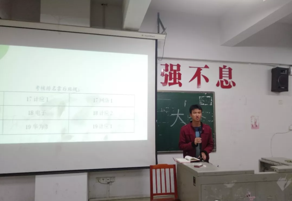最后,学生会主席刘培上台发言,对优秀班级和优秀寝室进行鼓励,同时也希望别的班级能以他们为榜样,保持进步,共同前进。