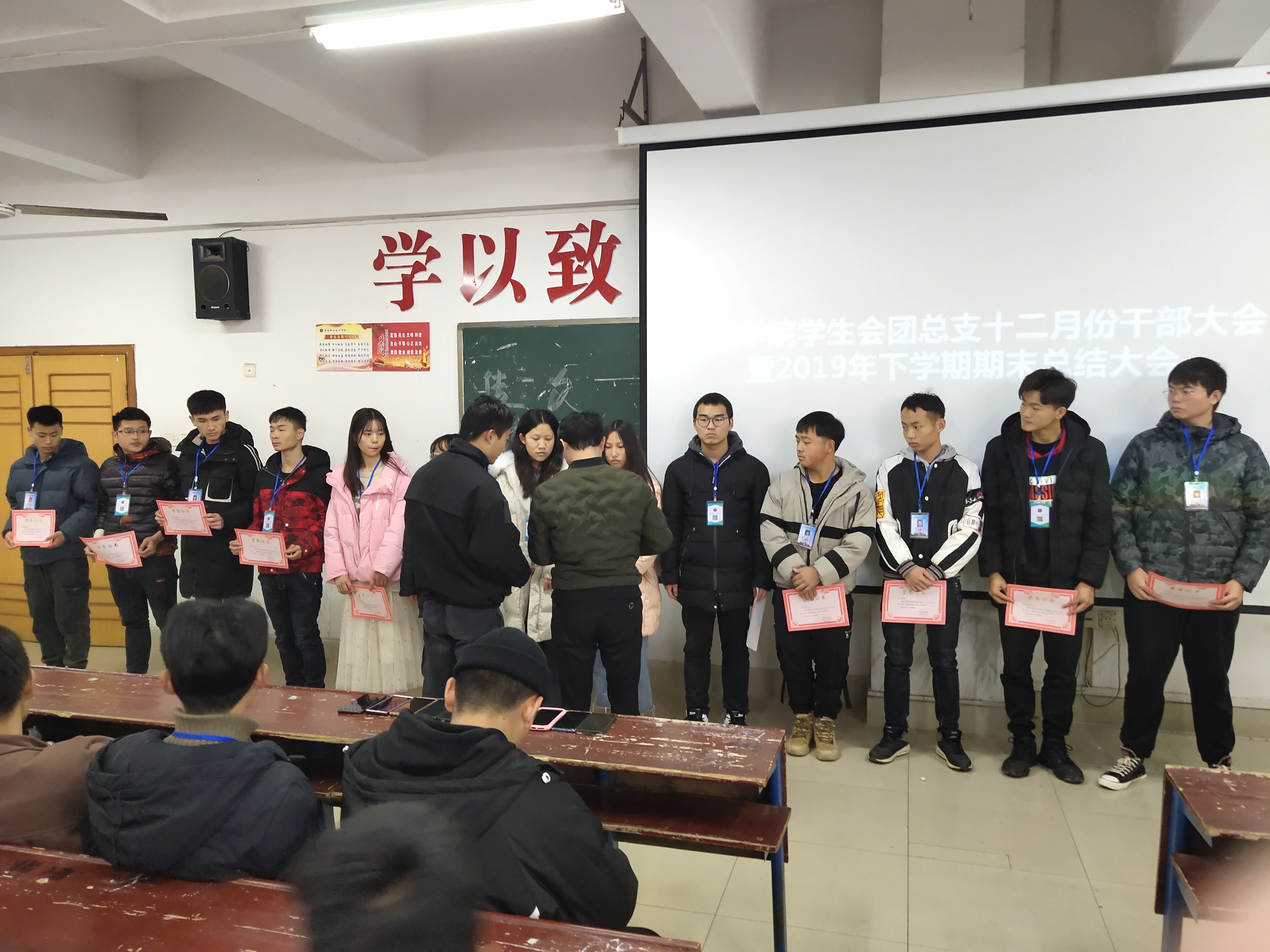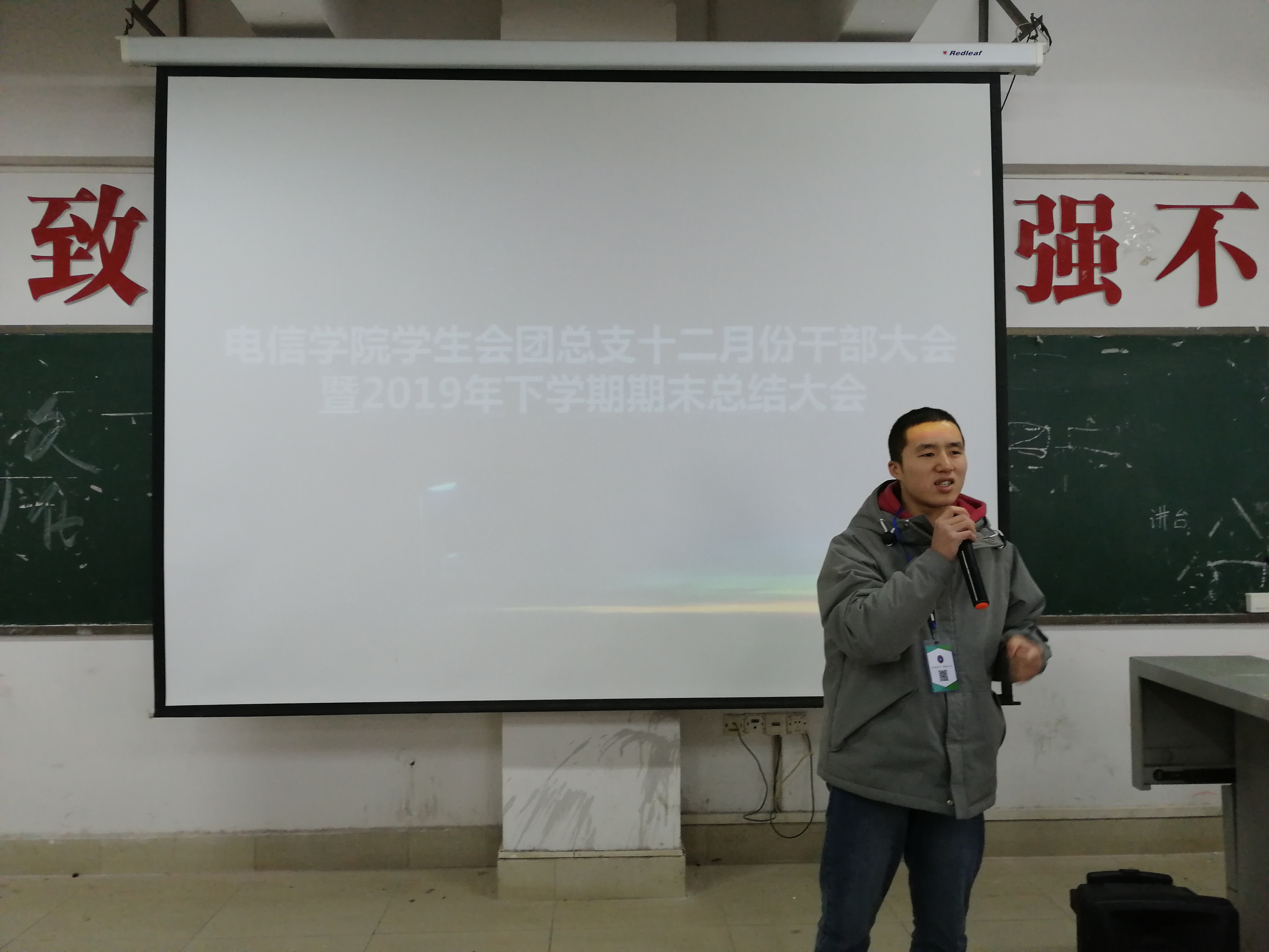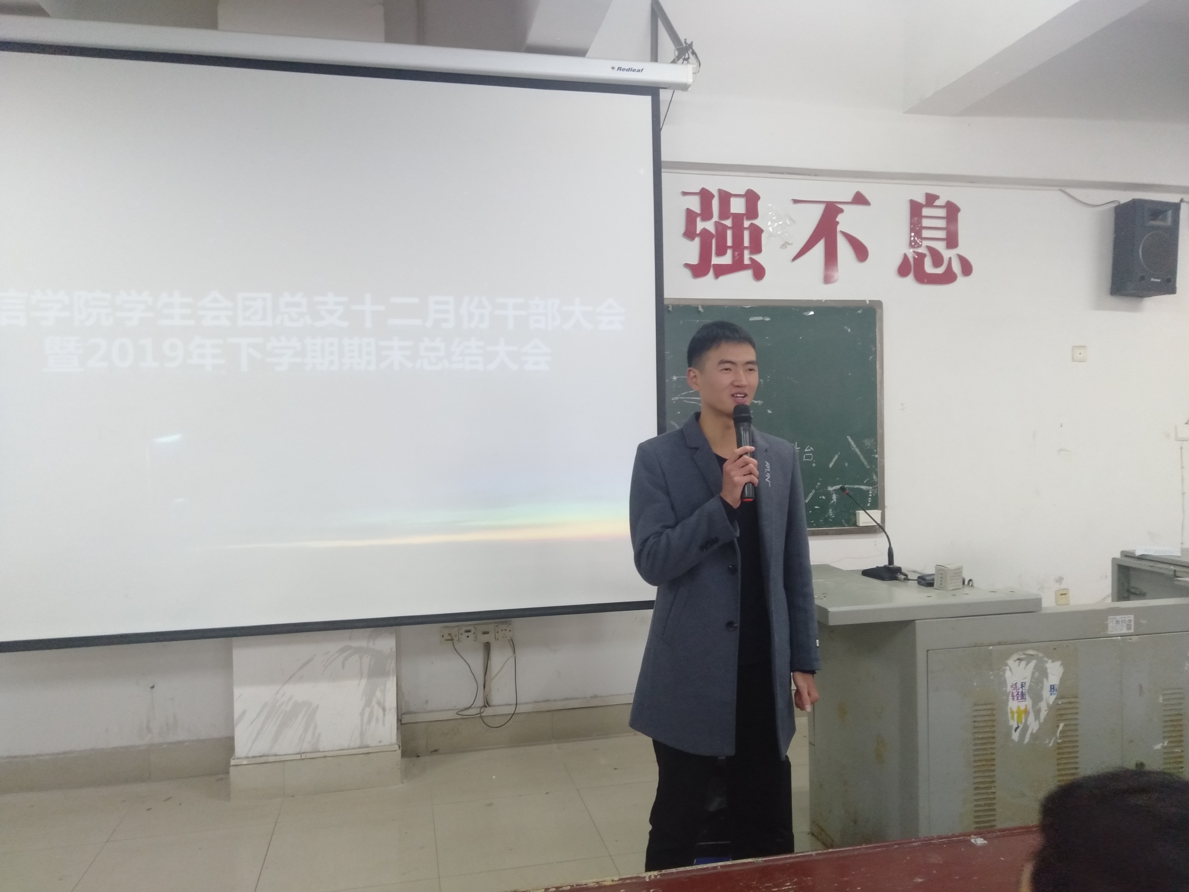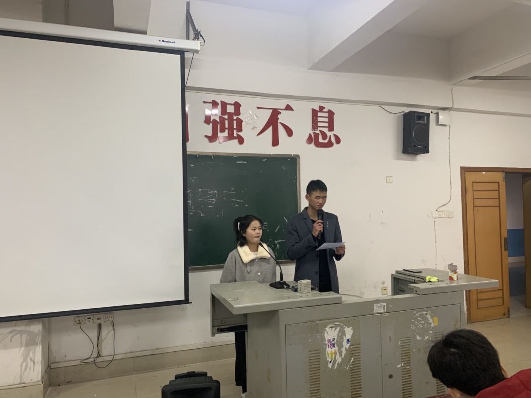 本次大会共共分为4项,大会第一项由学工副院长晏然讲话,第二项由学工干事周永坚讲话,晏然院长和周永坚老师给我们总结了这一年我们工作的优秀之处和不足之处,给了我们指出明确的目标同时希望我们在新的一年里工作更加认真积极。