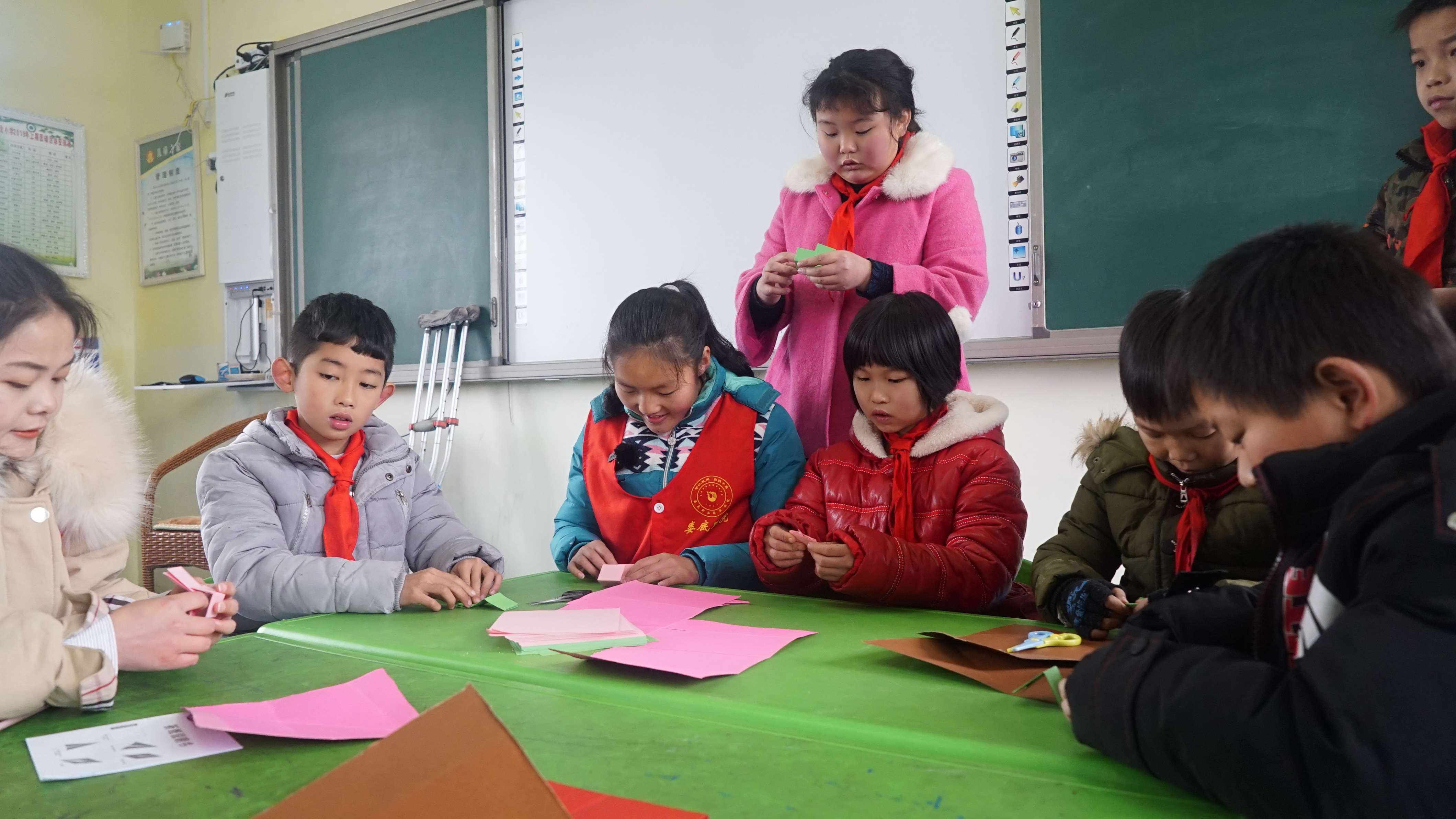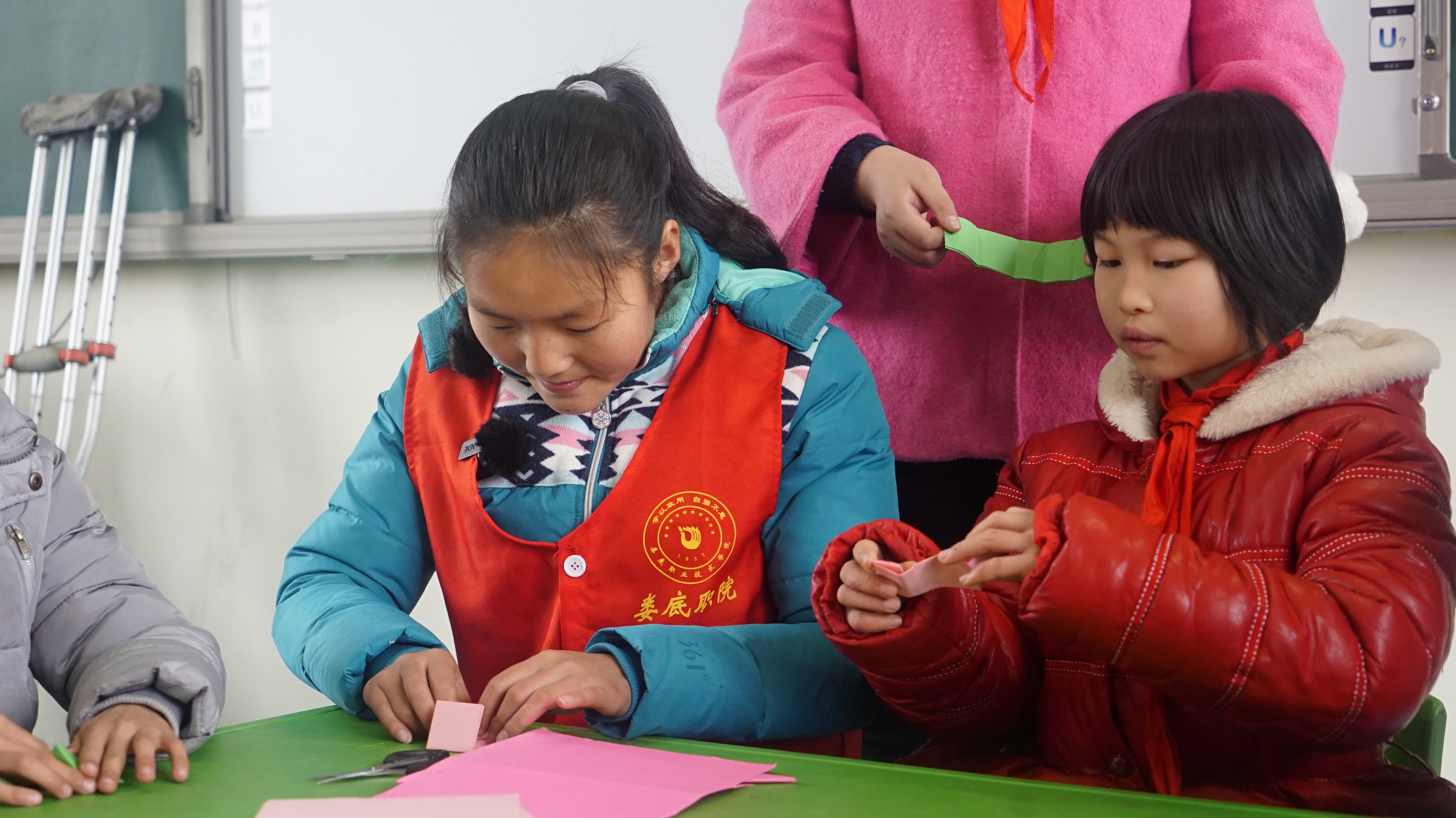三组:由刘丹、毛新庆同学以音乐美术为授课内容,对孩子们进行教学,二人分工明确,刘丹同学传授孩子们剪纸方法和技巧,毛新庆同学则同孩子们欢歌,教室里一幅欣欣向荣的景象。