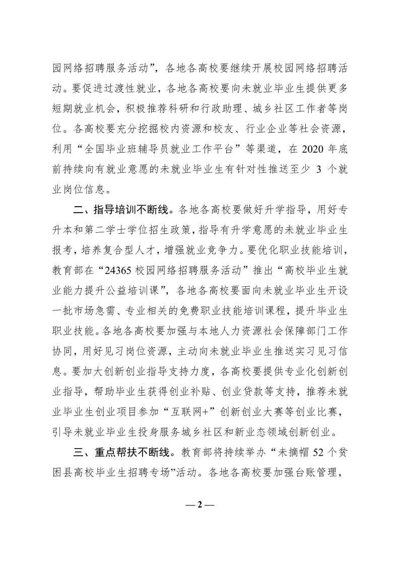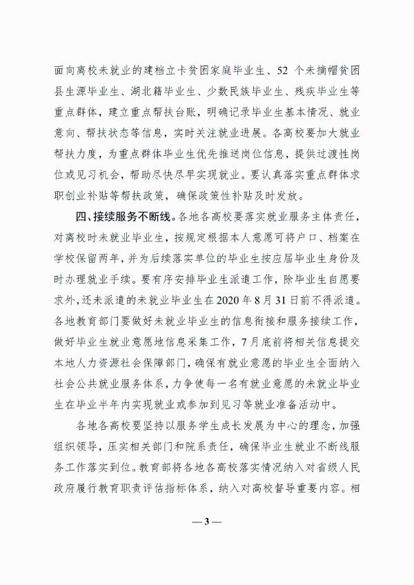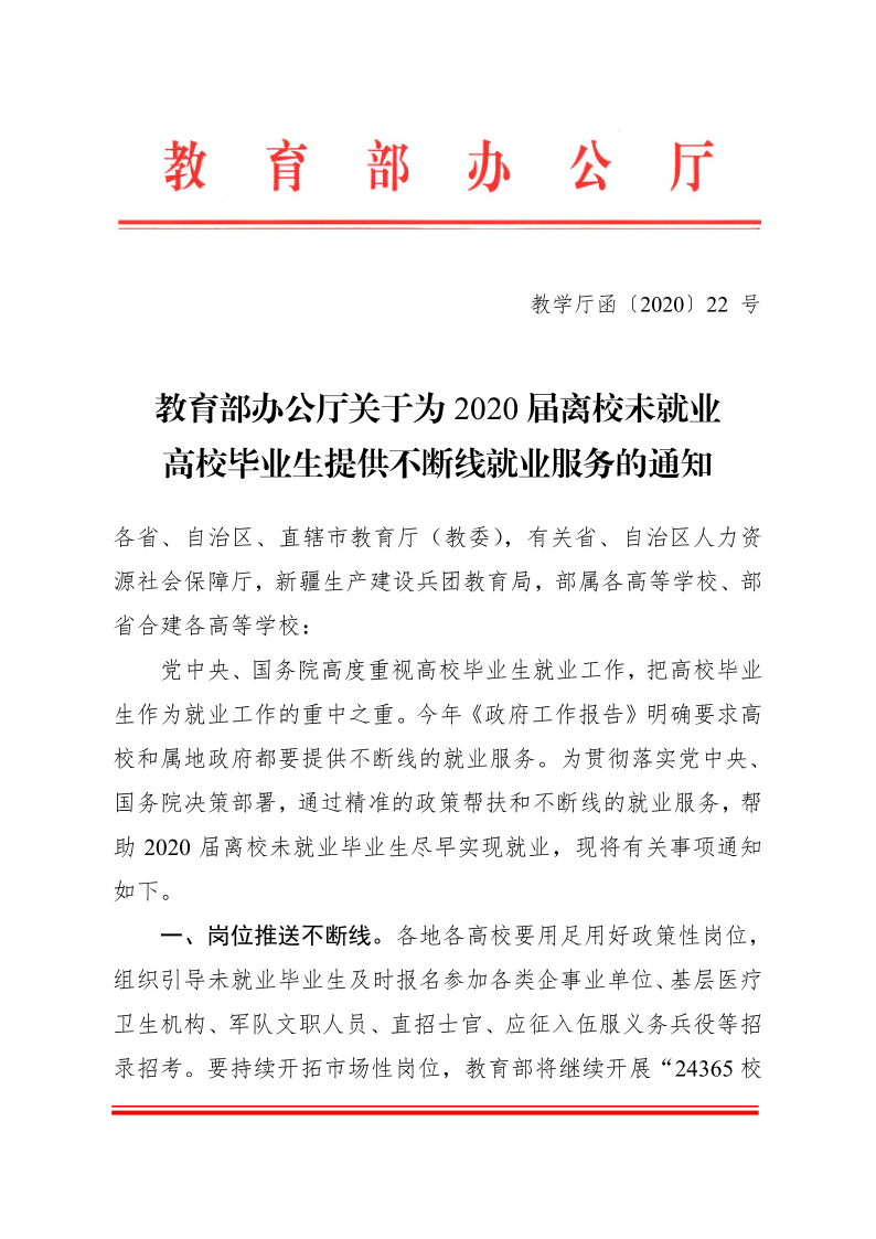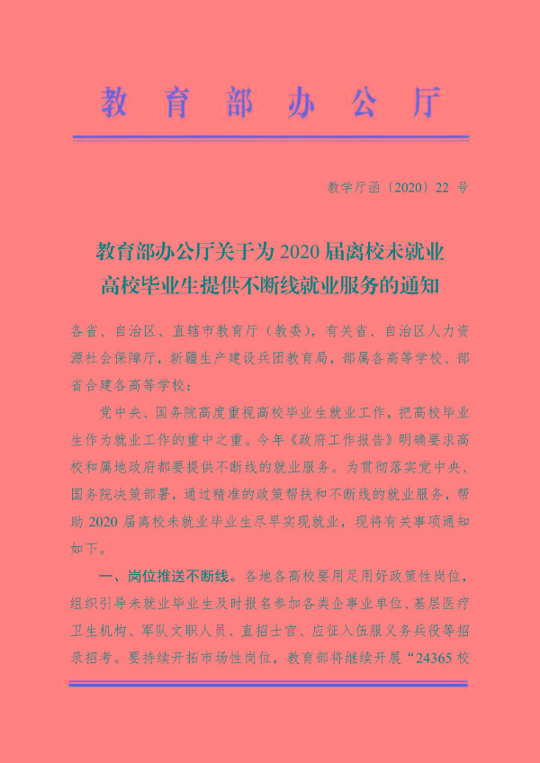教育部办公厅关于为2020届离校未就业高校毕业生提供不断线就业服务的通知