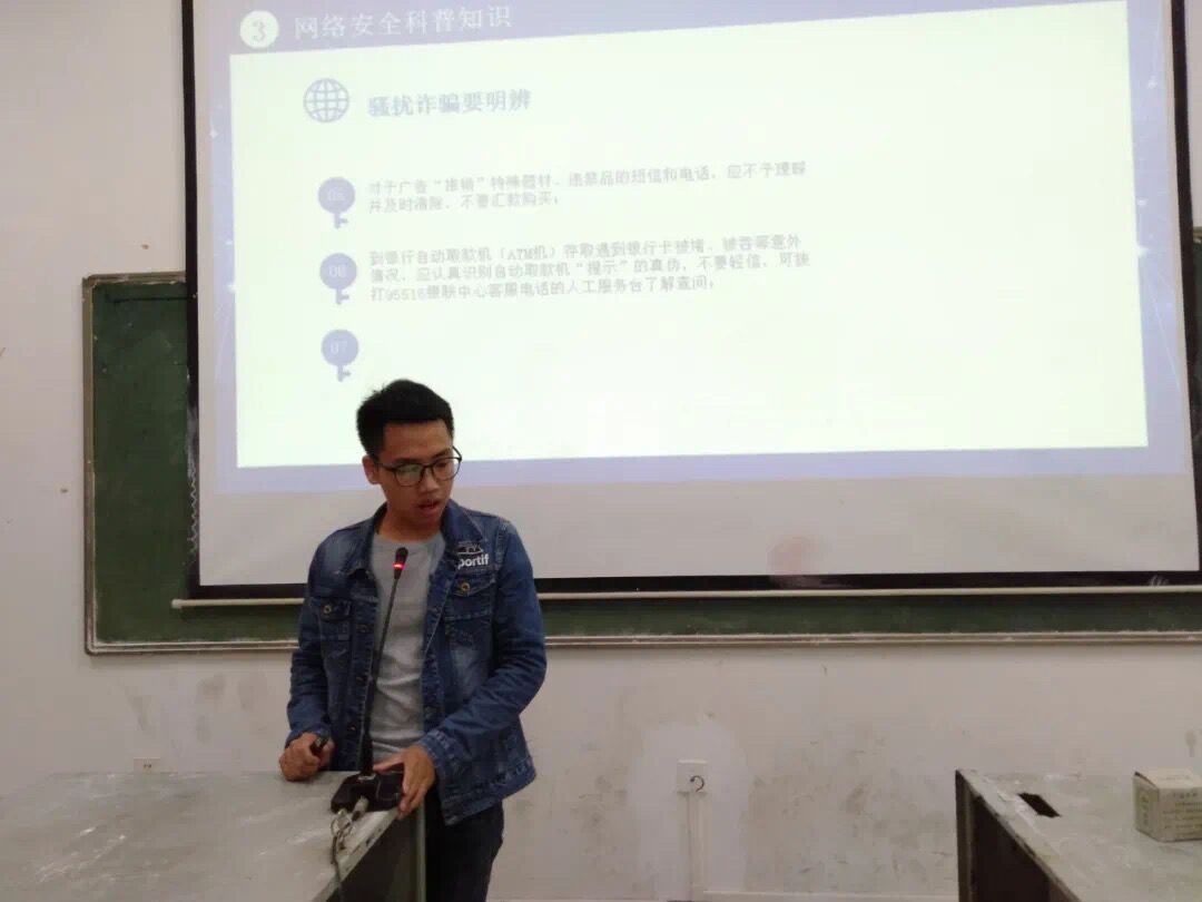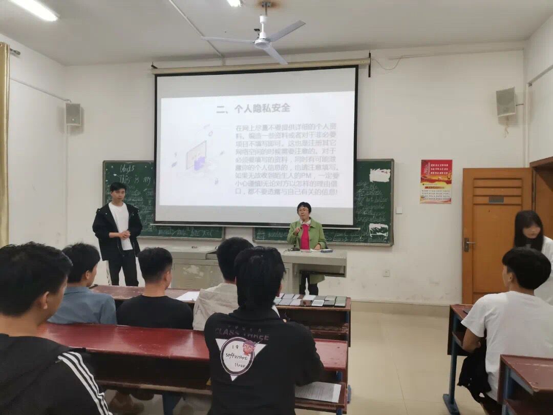 班会开始后,由各班团支书简单介绍了关于网络安全教育方面的相关知识,然后通过具体的一系列的案例分析向同学们讲述了一些校园周边存在的网络安全隐患和网络安全常识,并以网络安全知识竞赛的方式进行了进一步的调查提问,同学们纷纷积极配合。最后,各班团支书再次强调了网络安全教育的重要性,提高同学们关于网络安全防范的意识。