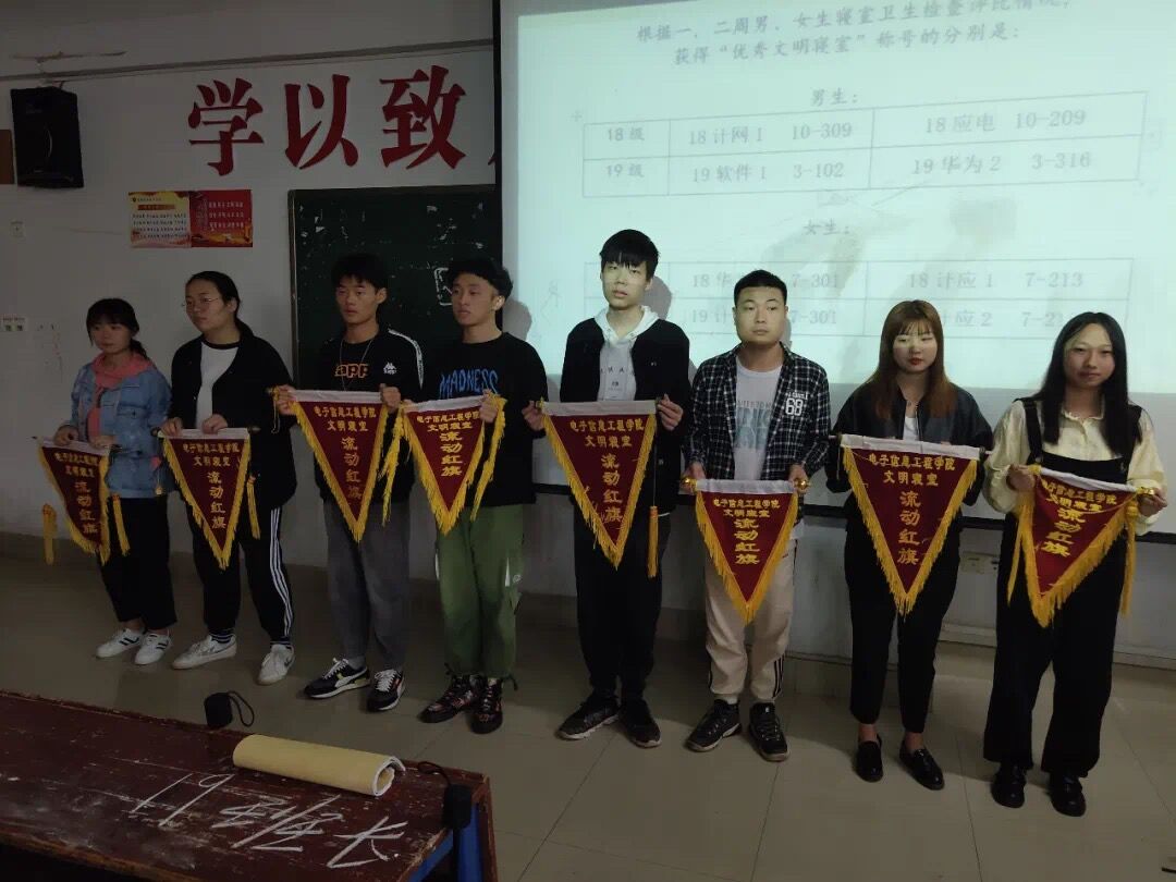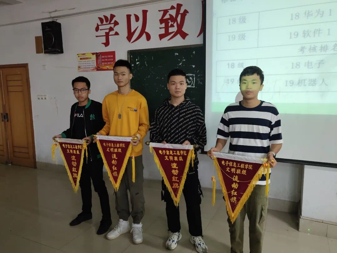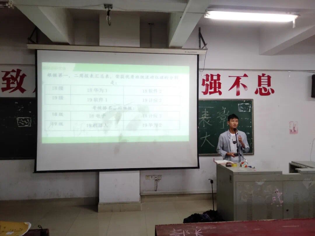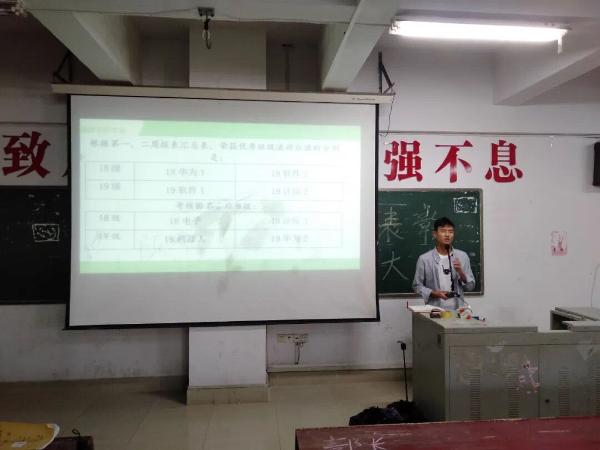 会议伊始,刘培针对这两周的综合评比的数据进行评比,根据综合数据的评比诞生了四个优秀班级和八个优秀文明寝室。接着,刘培对两周的班级考核汇总进行评价,最后,由社团实践部部长杨柳和学习部部长李佳琴轮流为四个优秀班级中靠前的两个班级和八个优秀文明寝室颁发流动红旗。