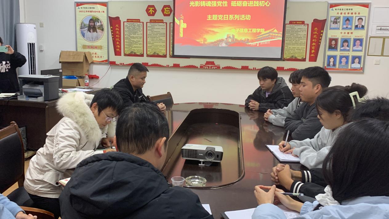 为了增强党员和预备党员的奋斗精神,电子信息工程学院学工党支部于2023年11月16日下午4点30分,在实训楼301开展 “光影铸魂强党性,砥砺奋进践初心”主题党日活动。本次活动由学工党支部组织委员周永坚老师负责,宣传委员李韶辉老师记录,党建部干事配合,学工党支部党员、预备党员参与。
