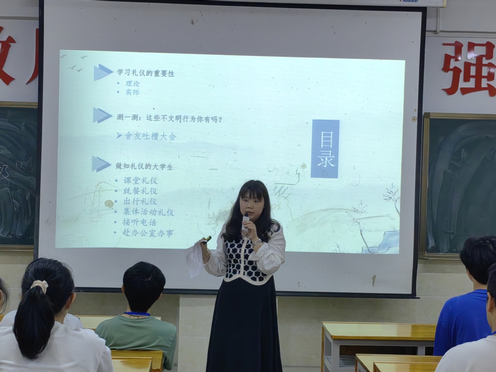 林莎还强调了学生干部应具备的责任感、公正心和团队精神等优秀品质,并鼓励他们不断提升自我,塑造良好品格。她特别提到了日常礼仪的重要性,提醒学生干部们在工作、生活和人际交往中要注重礼仪,以促进人与人之间的有效沟通,并提升个人专业形象。