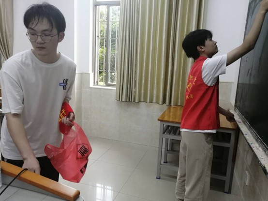 经过几个小时的辛勤劳动,教室、宿舍环境焕然一新。原本有垃圾的教室和灰尘被清理得干干净净,教室座椅和黑板也变得光亮如新。入党积极分子们看着自己的劳动成果,脸上露出了满意的笑容。