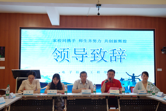 林莎首先对家长们的到来表示热烈欢迎,致以诚挚且热烈的问候,并且向大家介绍了与会的各院领导们。他首先邀请了电信学院的副院长邓明亮致欢迎词。邓明亮详细介绍了学院的发展概况、专业设置、师资力量以及教学成果等方面的情况,让家长们对学院有了更深入的了解。他希望家长和学校携手共建家校共同体,更好地帮助学生成长成才。