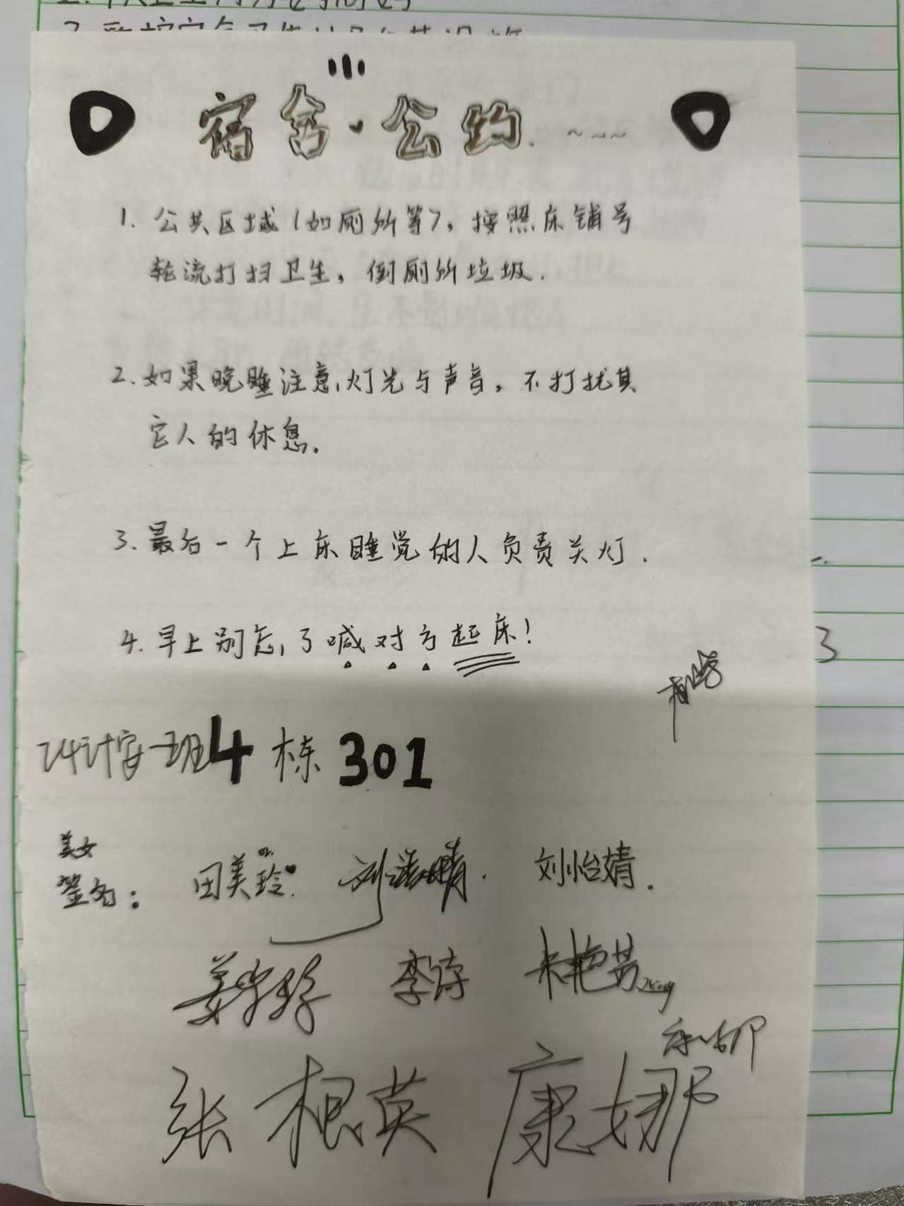 各班委针对大学生常见寝室问题,深入分析内在原因和现实因素。引导同学们掌握预防措施和解决方法,帮助合理解决寝室问题,还签订了宿舍公约,内容涵盖保持寝室卫生、维护良好秩序、注重个人隐私等方面。