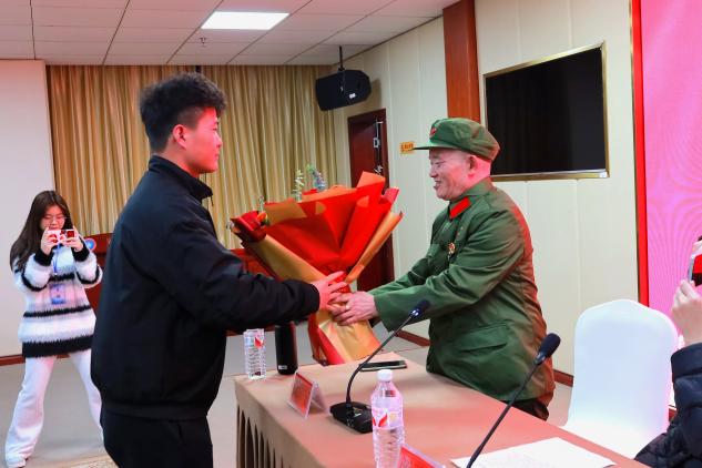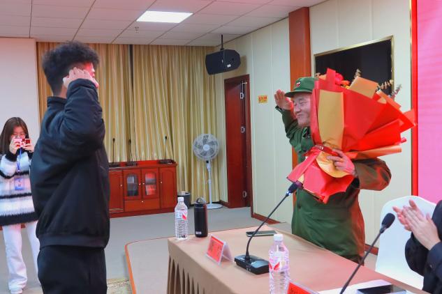 最后,学生代表张云权手捧鲜花,庄重地向老兵宣讲员献上敬意,并合影留念。这一刻,相机定格了军人与学生之间跨越年龄与经历的深厚情谊,也记录下了红色基因传承的珍贵瞬间。