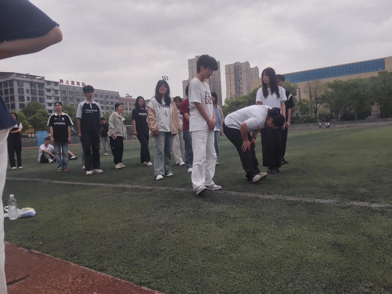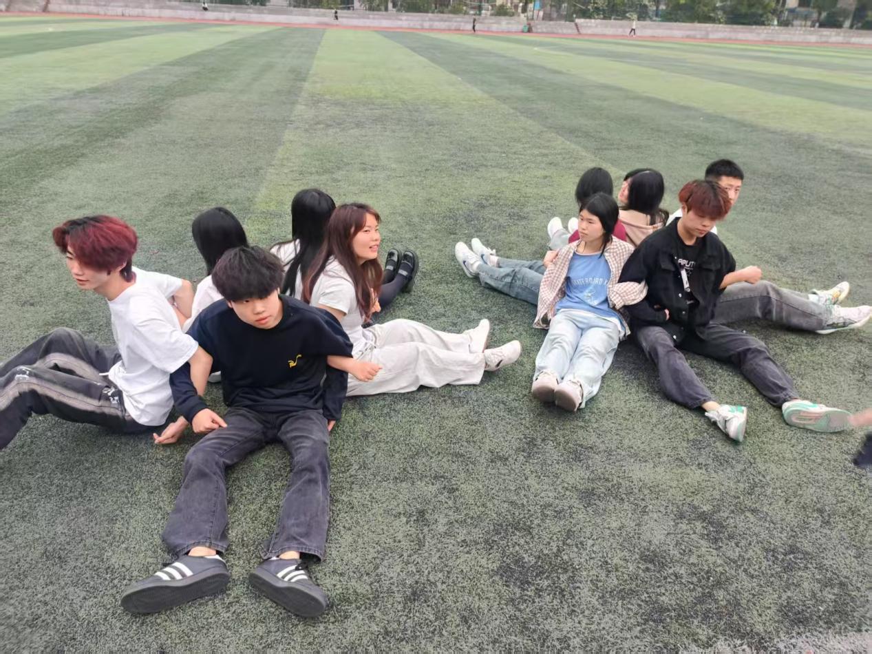 “坐地起身,聚力共成长”,将活动推向高潮,同学们需背对背围坐成圈,手挽手协力站起。看似简单的动作,却需要团队高度协调过程中,成员们不断尝试策略,最终在相互支撑中成功站立,深刻体会到“信任”与“配合”的重要性。