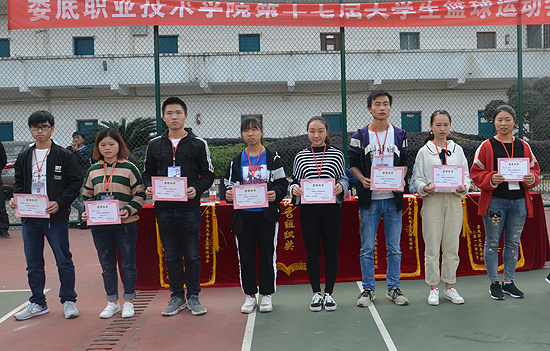 | 11月2日下午,我校第十七届大学生篮球运动会在圆满完成全部赛程后于篮球场举行闭幕式。副院长周志和、学工处处长李规、副处长肖靓出席闭幕式并为获奖队员颁奖。 第十七届大学生篮球运动会共有21支篮球参赛队、252名运动员参与其中,200多名裁判员和工作人员为比赛服务,56场比赛吸引了近16000名师生到场观看,经过近两周的激烈角逐,最终电子信息工程学院、土木工程学院、会计学院获得男子甲级联赛前三名;农林工程学院、汽车学院、五年制高职部获得男子乙级联赛前三名;护理学院、文化传播学院、会计学院获得女子组前三名;护理学院周云钗、电子信息工程学院邹翔获得MVP最有价值球员称号;申周华等10人获得优秀裁判员称号;唐年旺等10人获得优秀工作人员称号;护理学院、农林工程学院获得优秀组织奖;会计学院、医药技术学院获得道德风尚奖。李规宣读了比赛成绩。 在热烈的掌声中,副校长周志和宣布我校第十七届大学生篮球运动会闭幕。 闭幕式后举行的全明星赛吸引了校内师生到场观看助威,也为本次大赛划上一个圆满的句号。(周星 蒋田田 )