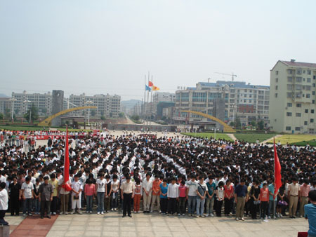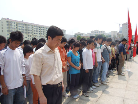 14点28分,汽笛和警报齐鸣,国旗哀垂,全体参加捐款仪式的师生低头肃立,向在灾区罹难的同胞默哀三分钟,寄托对罹难同胞的哀悼之情。