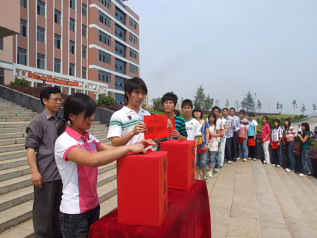 5月19日14时许,我院全体在校学生在校园广场向四川地震灾区人民捐款。仪式由团委书记杨惠梅主持,党委委员、工会主席刘自斌在5月19日的讲话中号召大家用实际行动实践社会主义核心价值观,用真情支持灾区人民恢复生产、重建家园。财经贸易系学生刘芬、公共事务管理系学生苏霞向全体同学发出倡议,号召我院学生积极向地震灾区人民捐款。各班学生代表依次走到捐款箱前为地震灾区的群众捐款,截止发稿时共计捐款78924.50元。同时,我院部分四川籍学生带领全体与会学生合唱《爱的奉献》、《感恩的心》、《让世界充满爱》等歌曲。此时此刻的我院广场汇集成一片爱的海洋。