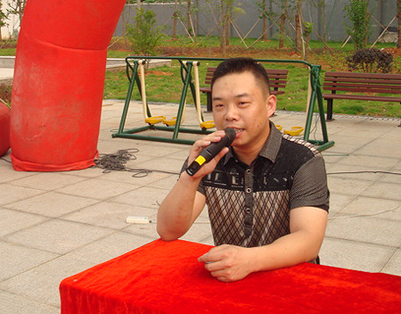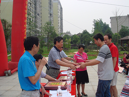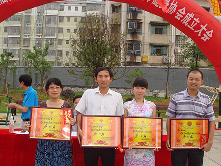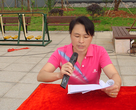 歌舞健身会长胡霞玲发表任职讲话。表示协会将在和谐、快乐、健康、坚持的原则指引下。在阳光下健身,在广场中歌舞。协会会员互教互学,互相督促,以最低的成本,享受健康和快乐!曾国基向胡霞玲颁发了协会负责人聘书、音箱等器材及活动场地钥匙。