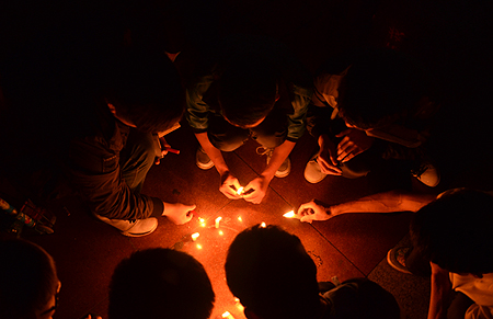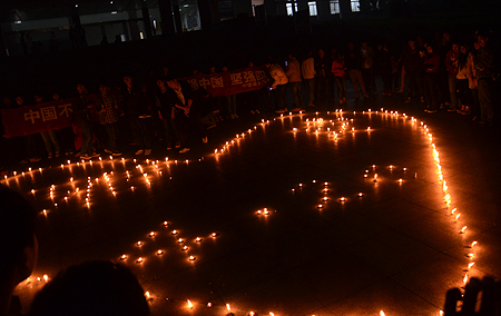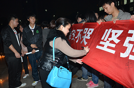 广场上,同学们手捧蜡烛,默默的站成了一个心形,没有言语,静静的为雅安祈福。随后,大家有秩序的依次在横幅上签下自己的名字,并在广场上放飞了满载祝福的孔明灯。不少教职工和教师家属也加入到祈福的心形阵列中来,活动持续了一个多小时。