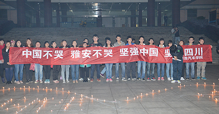 25日晚,由我院四川籍学生、院爱心协会、中德诺浩汽车学院自发组织的为雅安地震灾区祈福活动在我院文化广场进行,院团委欧芳书记、中德诺浩汽车学院院长封权初、副院长苏志华来到了祈福现场,表示对灾区的祝愿和支持。