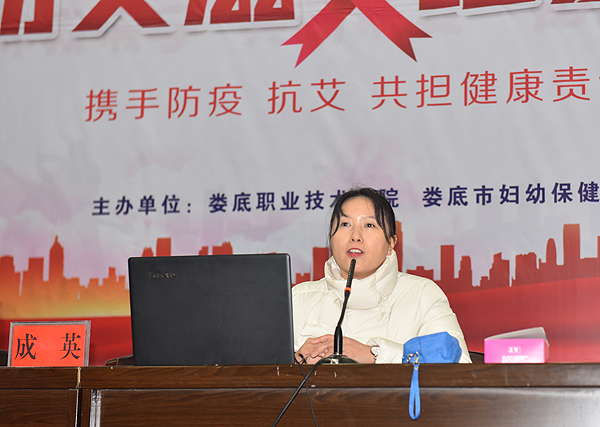 为增强我校学生艾滋病防治意识,12月2日,我校与娄底市妇幼保健院联合开展的“预防艾滋,珍爱生命”专题讲座在学术报告厅举行。娄底市妇幼保健院副院长龚伯雄,我校学生工作处处长李规、副处长肖靓,娄底市妇幼保健院健康教育科主任唐春梅出席本次讲座。由娄底市妇幼保健院产后保健科主任、妇产科副主任医师成英主讲。各二级学院学生代表聆听讲座。
