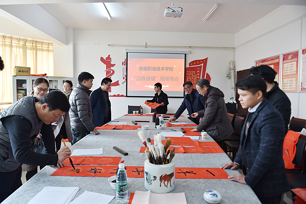 今年年初,校书画协会在校内开展“迎春接福”书法笔会,邀请了娄底市书法研究会会长曾贯一、副会长胡卫平,娄星区文联主席李哲,娄星区书法家协会会长刘翼军等娄底市书法界知名人士,齐聚职院挥毫泼墨,为我校教职工们创作了一幅幅笔力劲挺、独具风格的春联。校领导朱忠义、张征澜、周志和、游新娥等到现场观摩,并与书法家们亲切交谈。
