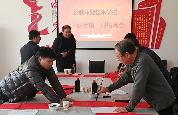 今年年初,校书画协会在校内开展“迎春接福”书法笔会,邀请了娄底市书法研究会会长曾贯一、副会长胡卫平,娄星区文联主席李哲,娄星区书法家协会会长刘翼军等娄底市书法界知名人士,齐聚职院挥毫泼墨,为我校教职工们创作了一幅幅笔力劲挺、独具风格的春联。校领导朱忠义、张征澜、周志和、游新娥等到现场观摩,并与书法家们亲切交谈。