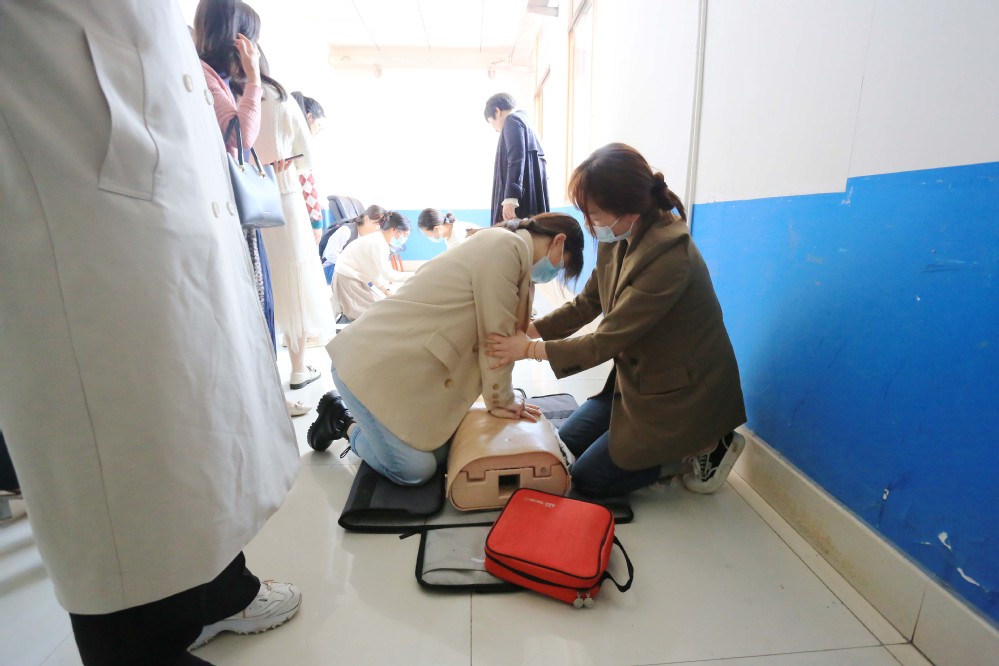 动作示范后,市中心医院健康管理党支部党员团队分成6组利用人体模型对教师们手把手进行现场实操培训,教师们踊跃参与到实践操作中来,亲身体会心肺复苏术操作中患者意识的判断、体位的摆放、按压的深度等细节问题。培训后,市中心医院健康管理党支部党员和团队分组对所有教师现场考核,并指导网上理论考试,考试合格的教师将获现场救护第一目击者培训合格证书,让参与培训的每一个人都掌握急救技能。