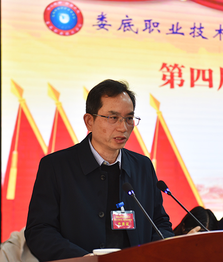 娄底市总工会党组成员、副主席邓江华发表讲话。他指出,我校在产业工人队伍建设改革和娄底“材料谷”建设中,使命光荣、责任重大。工会大有可为、大有作为。一是要旗帜鲜明讲政治;二是要凝心聚力促发展;三是要用心用情搞服务;四是要从严治校不懈怠。