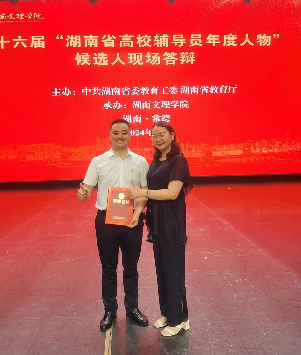 近年来,学校党委行政高度重视辅导员队伍建设,持续推进辅导员队伍向专业化、职业化、专家化发展,凝聚培养社会主义建设者和接班人的磅礴力量。柴斌连续两年获得“湖南省高校辅导员年度提名人物”荣誉称号,是中共湖南省委教育工委、省教育厅对我校辅导员队伍建设工作的充分肯定,彰显了我校辅导员队伍的整体水平和职业素养,这将激励和带动我校更多的辅导员教师坚定职业理想,争做行业先锋。(王欢妍)