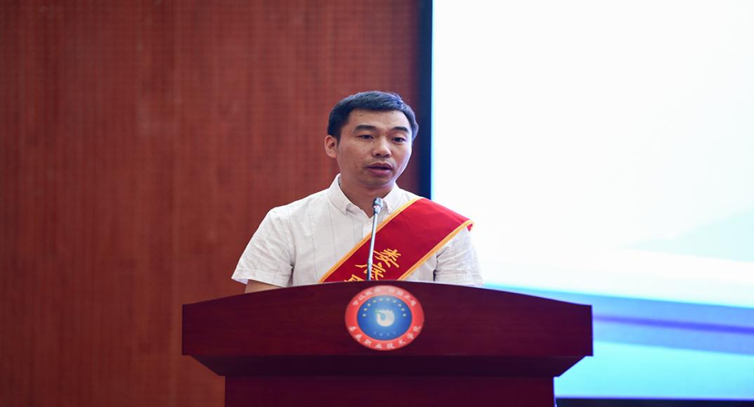 优秀教师代表周凌博分享了耕耘于职业教育一线所经历的挑战与艰辛、收获的成长与幸福,讲述了通过追忆教育救国先贤们的精神,激励他不懈探索与实践的心路历程,他表示将秉承初心、坚定信念,与大家共同携手书写娄底职院高水平建设的新篇章。