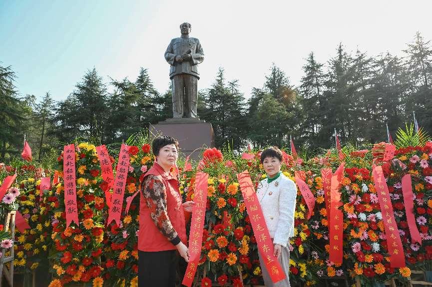 第二站,向毛泽东铜像敬献花篮。同志们来到毛泽东广场,在庄严肃穆的氛围中,向毛泽东铜像敬献花篮,表达对伟人的深切缅怀和崇高敬意。大家整齐列队,鞠躬致敬,不少老人眼中饱含热泪,现场气氛庄重而感人。
