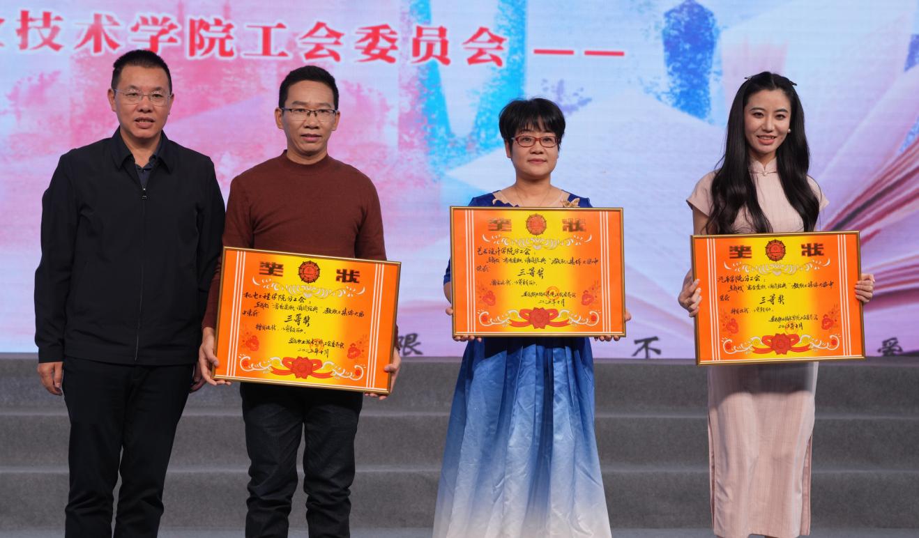 最终,经过公平评审,人事、工会、学保团联合队的《密码》,组宣网、党政办、招财基产联合队的《永远的旗帜》,建筑工程学院分工会《建筑人的少年中国说》荣获一等奖;文化传播学院分工会的《百年交响》,农林工程学院分工会的《我骄傲,我是中国人》,商学院分工会的《弦歌不辍•匠心百年》获得二等奖;汽车学院分工会的《红船》,艺术设计学院分工会的《我的祖国》,机电工程学院分工会的《赤壁赋》获得三等奖。周志和为获奖者颁奖并合影。