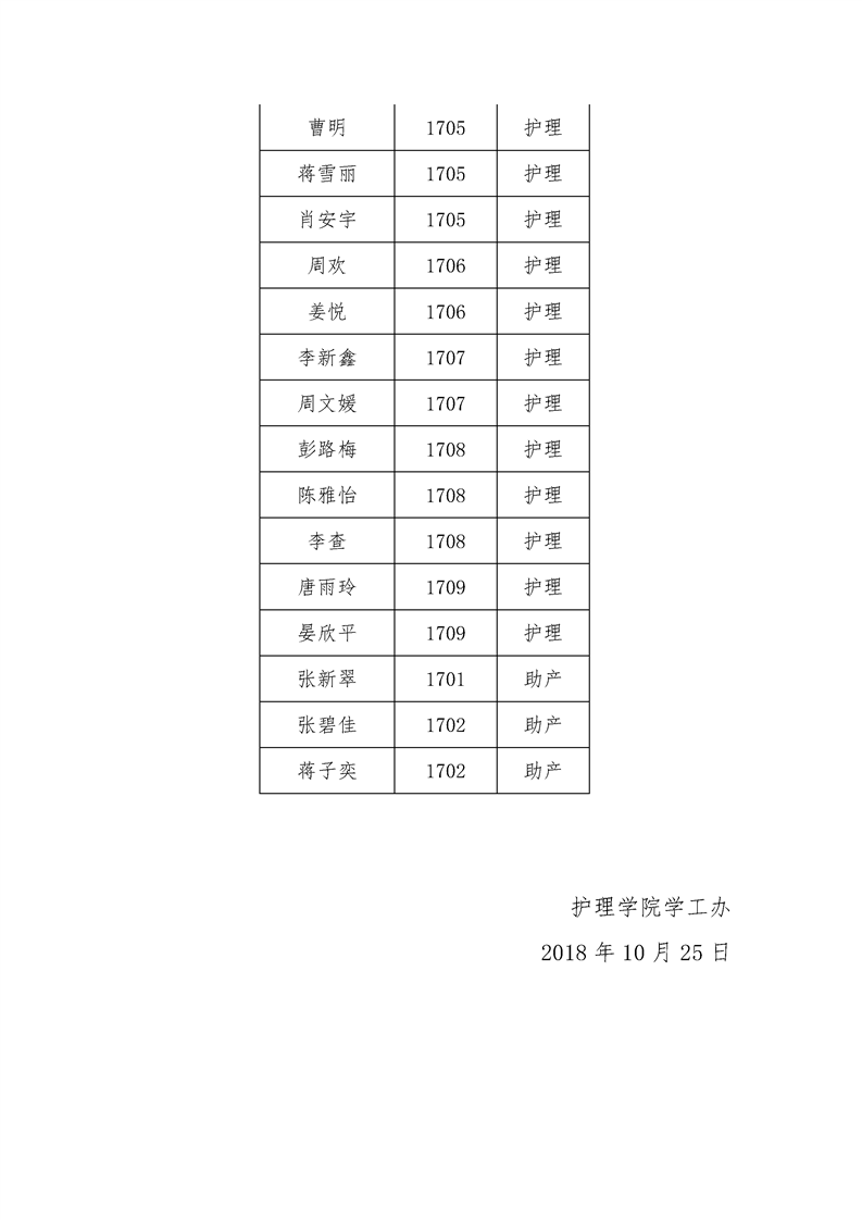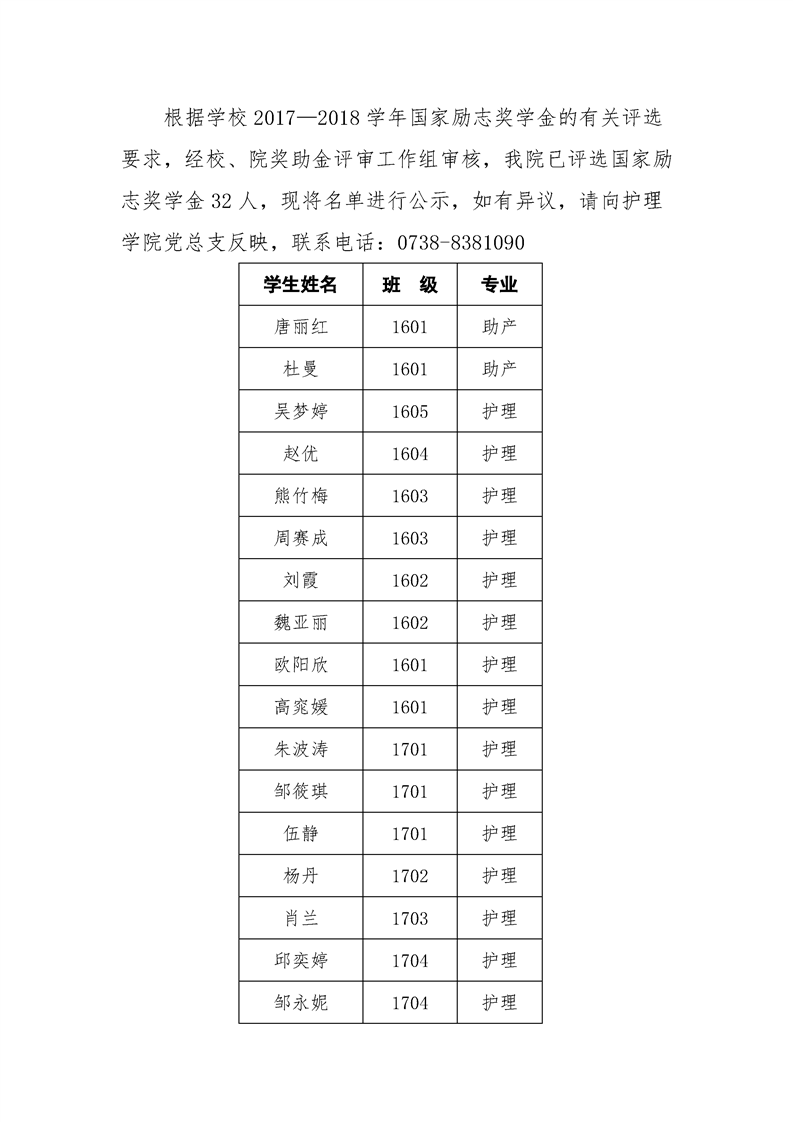 娄底职院护理学院2017-2018年度大专学生国家励志奖学金名单公示