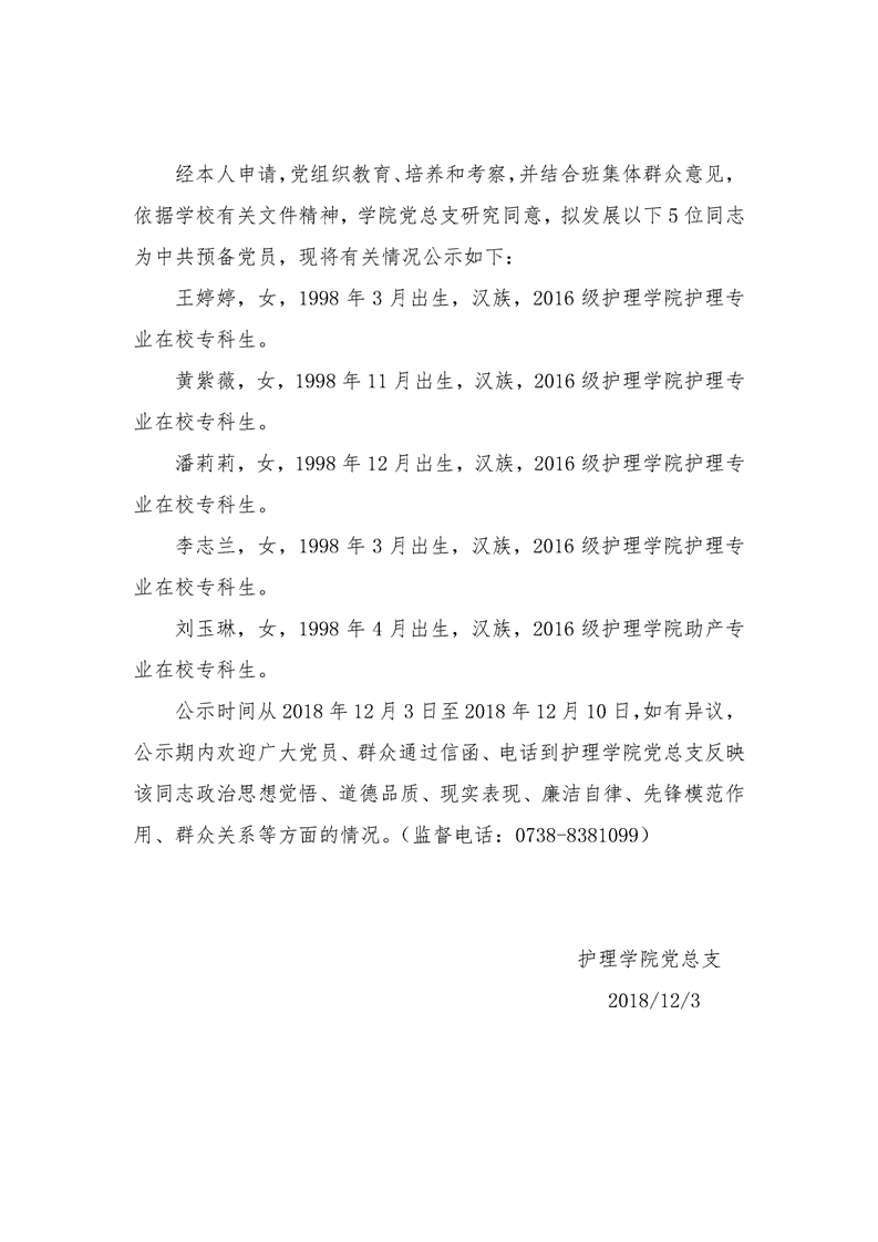 护理学院2018年发展对象吸收为中共预备党员名单公示