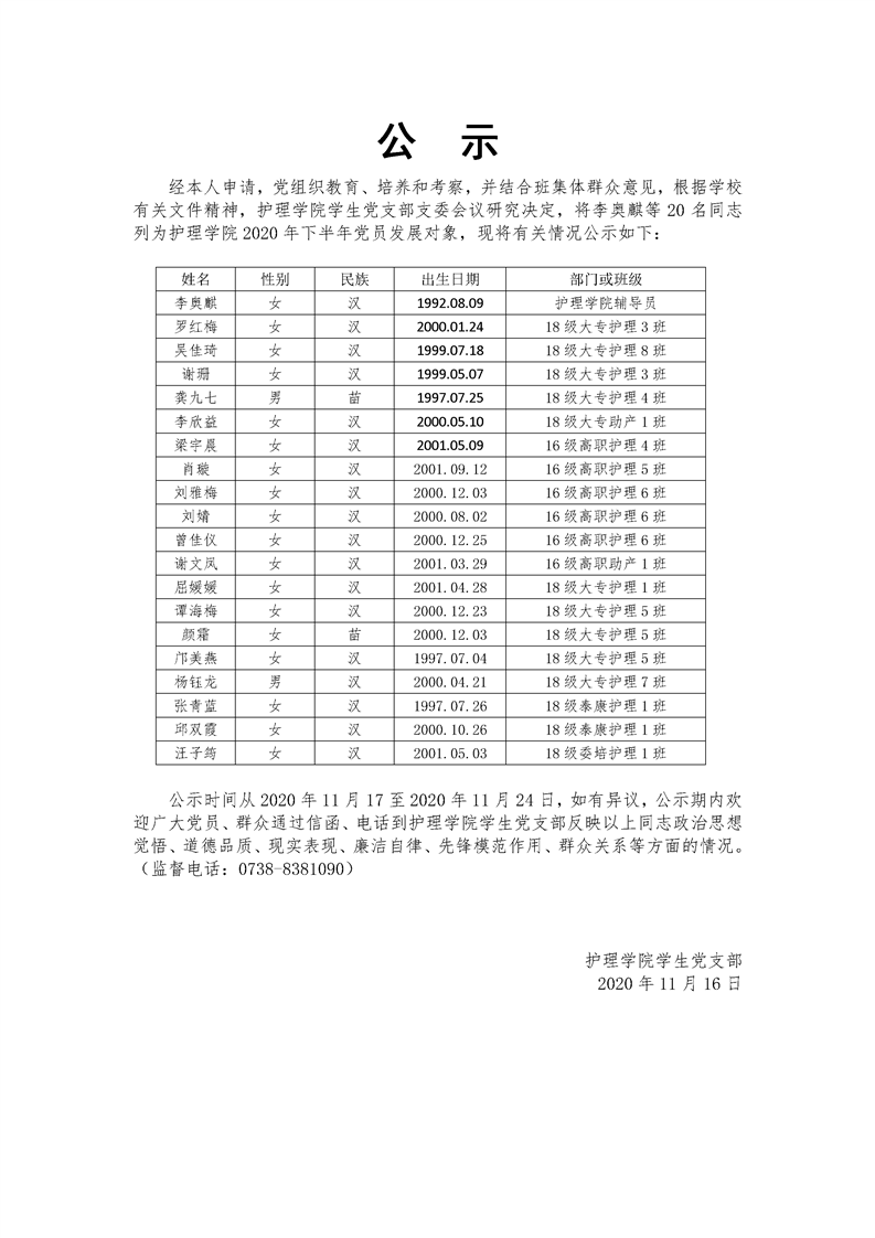 护理学院2020年发展对象名单公示