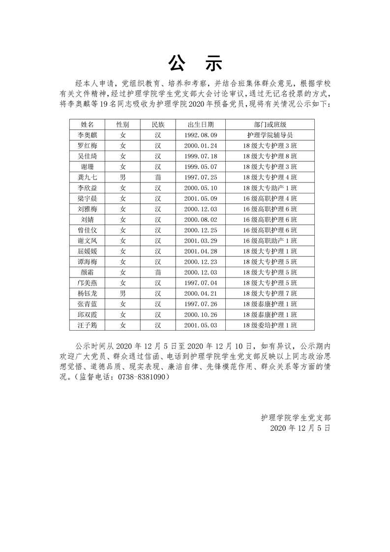 护理学院2020年下半年预备党员名单公示