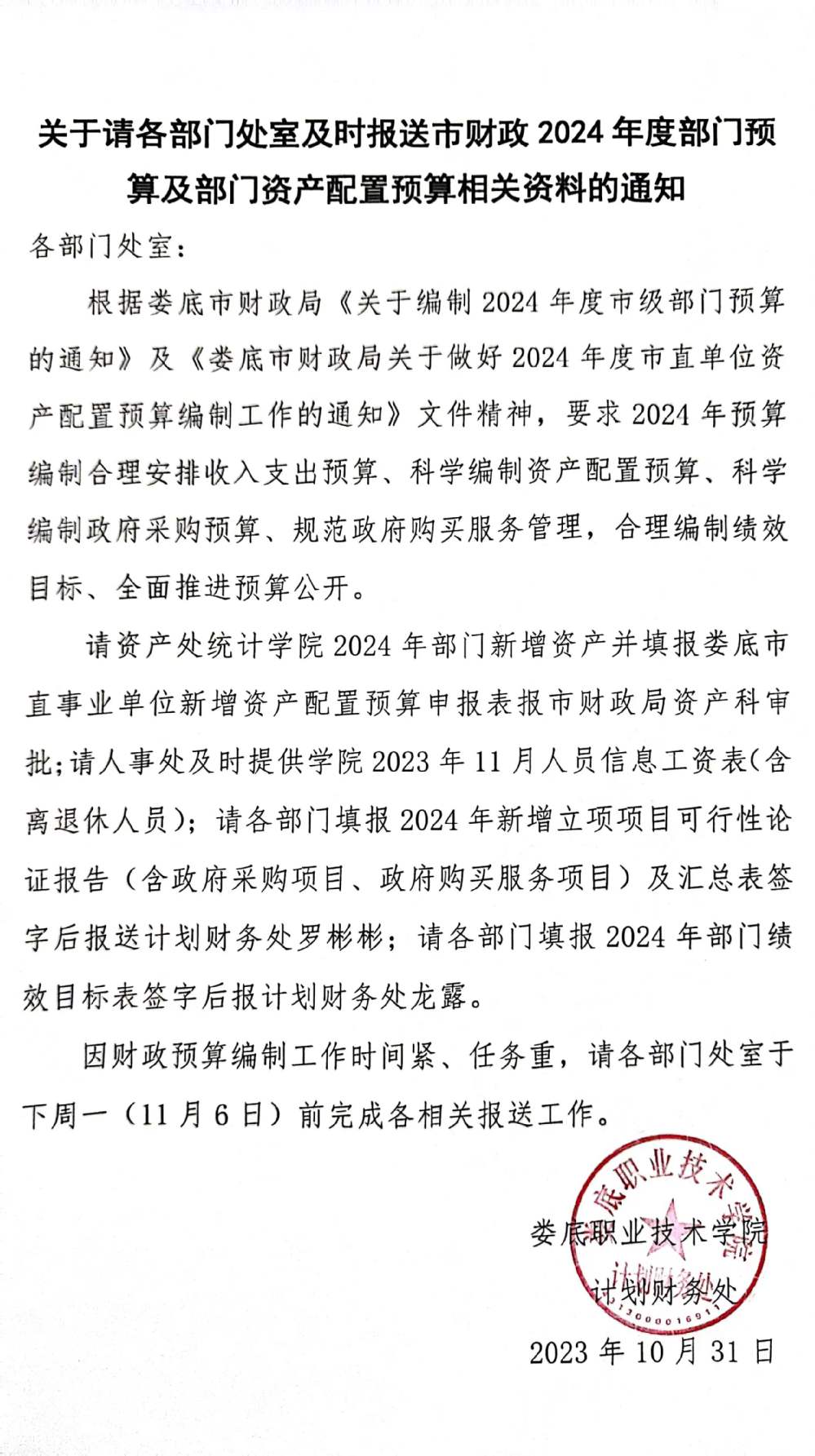 关于请各部门处室及时报送市财政2024年度部门预算及部门资产配置预算相关资料的通知