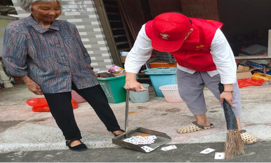 (图为志愿者在村里给老人家扫地)