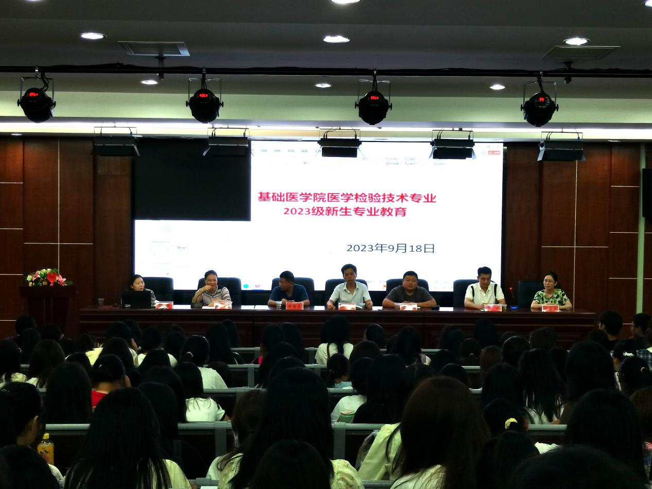 为帮助2023级医学检验技术专业新生更好地明确自身发展方向,了解所学专业现状及发展前景,树立远大理想,合理规划大学生活,基础医学院于2023年9月18日晚上七点半在医学部学术报告厅举办了“医学检验技术专业2023级新生专业教育大会”。基础医学院院长刘永堂、副院长贺丹毅、教研室主任、23级医学检验技术专业班级辅导员及270余名新生参加,会议由贺丹毅主持。