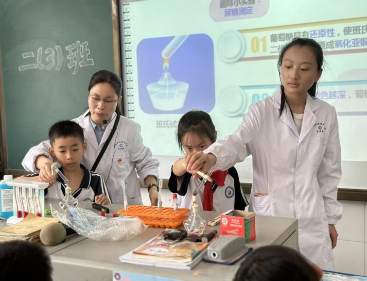 此外,来自23级医学检验技术5班的科普志愿者朱碧君同学分发了糖尿病防控的宣传资料,大手教小手指导孩子们体验互动小实验。
