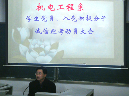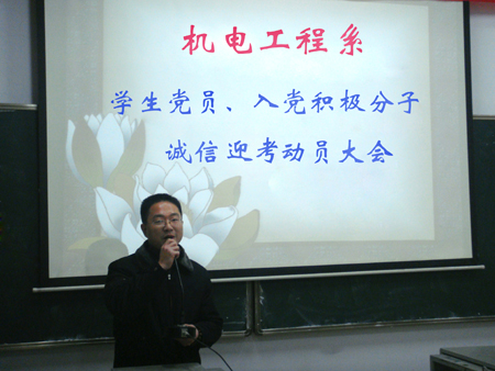 12月23日晚,机电工程系学生党员、入党积极分子诚信考试动员大会在主教学楼520教室举行。该系党总支书记刘跃华、系主任张海筹、学工副主任朱勇志、系团总支书记徐志豪及全体学生党员、入党积极分子参加了会议。大会由徐志豪主持。