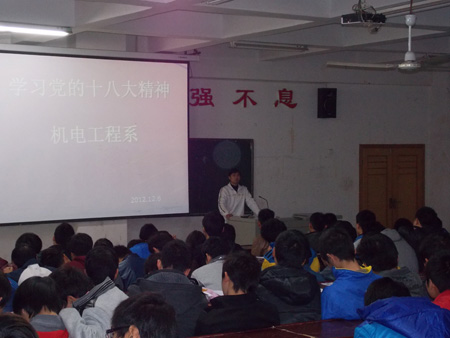 为了深入学习宣传贯彻党的十八大精神,积极响应学院号召,12月6日中午机电系团总支组织全系学生党员、团学干部、入党积极分子等在主教学楼110教室集中学习党的十八大精神,系学工副主任、团总支书记申再林做了重点介绍。首先他阐述了十八大召开的重要意义,要求全系青年大学生和团学组织用党的十八精神武装头脑,指导学习,推动工作。然后概述了党的十八报告的主要精神,中央纪委工作报告的主要精神,党章修正案的内容,要求每名团学干部、青年学生将此内容通读一遍,写一篇不少于3000字的学习笔记,并以班级为单位采取专题讨论、知识抢答等形式检验学习效果。