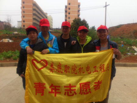 全班同学参加了志愿服务活动启动仪式,主题班会上畅谈雷锋精神,对班级卫生责任区域进行彻底清扫,在责任区值勤维卫,并3月15日下午,全班同学参加了“立标语、树人树己”的活动。志愿者们高举旗帜,头戴红帽,分别在学院食堂右侧、主教楼左侧、实训楼草坪旁、图书馆前树立了相应的标语牌。一路树牌、一路清扫,大家忙碌着并快乐着、、、、、、