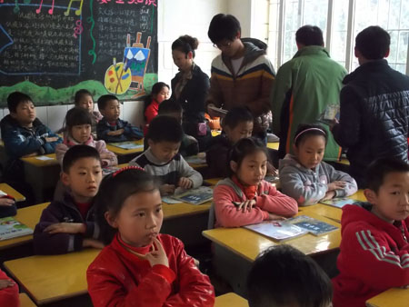 志愿者们一到娄底五小,就受到老师们和可爱的小朋友们的热烈欢迎,副校长彭琪出门迎接,在大队辅导员吴霞老师的带领下,志愿者们来到了教室。正值下课期间,志愿者贺飞来到讲台说明了来意并简单介绍了《弟子规》和《身边的雷锋典型事迹汇篇》:《弟子规》是中华民族灿若星河的文化经典中一颗耀眼的明珠,凝聚了古圣先贤的大智慧,浓缩了中华五千年的教育精华,熏陶了一代又一代炎黄子孙,这是一份宝贵的精神财富。《身边的雷锋典型事迹汇篇》记载了娄底职业技术学院培养起来的“活雷锋”,希望小朋友能好好学习,从书本学习,从身边的人物学习,从小做起,从自身做起,为实现“中国梦”而努力。小学生们聚精会神的听着,随后志愿者向老师和同学赠送了所带书籍,小朋友可谓是爱不释手,他们纷纷表示:一定要继承中国传统文化,努力学习,争做新时期的“活雷锋”,为实现“中国梦”而贡献自己应有的力量。