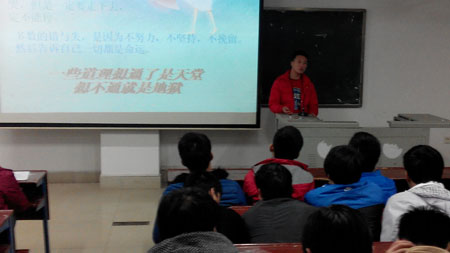 2014年3月9日晚七点半在主教学楼510教室,由机电系举办的个人励志演讲圆满成功。本次演讲者是机电系学生会副主席―廖小慧同学。系学工主任申再林,辅导员袁丽娟、田玉、贺飞及机电系13级全体学生参加了此次活动。