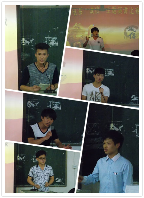 诚信,是什么?诚,即真诚、诚实;信,即守承诺、讲信用。通俗地表述,就是说老实话、办老实事、做老实人。2014年5月8日晚7:30在主教楼310教室举行机电系“诚信”主题演讲比赛。系学工主任申再林、辅导员黄秧春、唐明月、袁丽娟、李益得、贺飞及系学生会和部分13级班级参加。