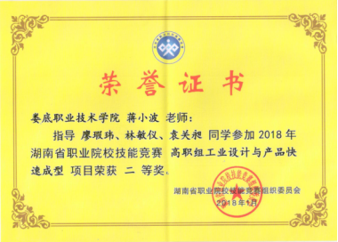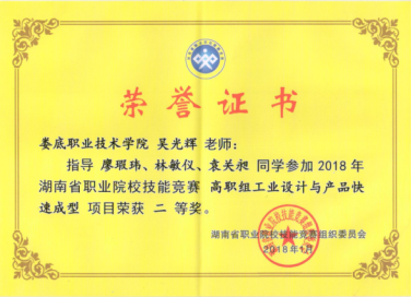 在湖南省教育厅举办的2018年湖南省高等职业院校技能竞赛中,机电工程学院吴光辉、蒋小波二位老师指导的15级模具专业袁关昶、林敏仪、廖瑕玮3人组参加了高职组“工业设计与产品快速成型”项目的技能竞赛,经激烈角逐荣获二等奖、全省排名第三的好成绩。
