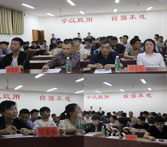 担任本次评委的有机电工程学院党总支书记廖婧华、娄底电视台副总监梁照斌、机电工程学院教学副院长罗正斌、学工副院长梁艳丰、团委副书记李权、团总支书记邓腾、指导老师唐明月、朱冬、向浪,还有机电工程学院全体学生会成员。