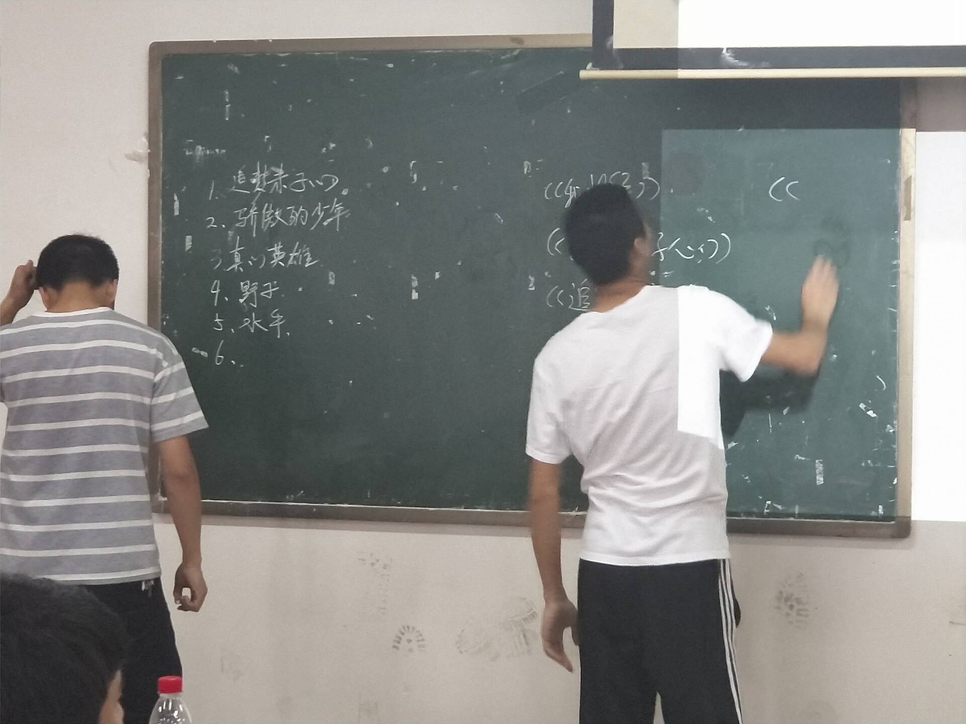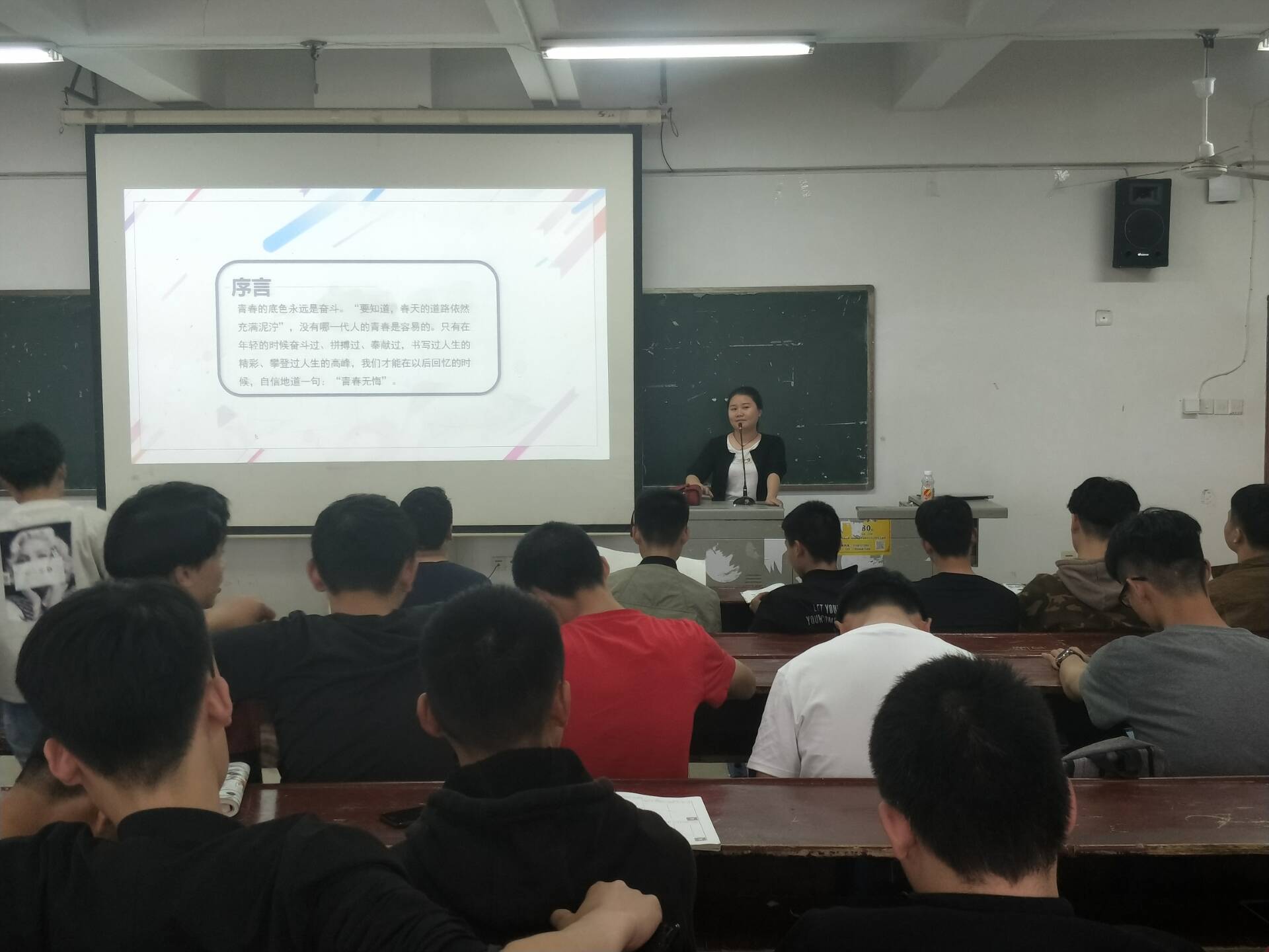 活动开始,由主持人开始比赛前讲解。活动第一环节:奋斗歌曲知多少,同学们踊跃参与。第二环节:演唱奋斗歌曲,在开展活动的同时发现同学们的艺术细胞。活动进行时,同学们先上台在黑板上写下要演唱的歌曲的歌名,再按报名顺序进行演唱,整个活动期间现场气氛非常活跃,同学们积极的参与比赛。