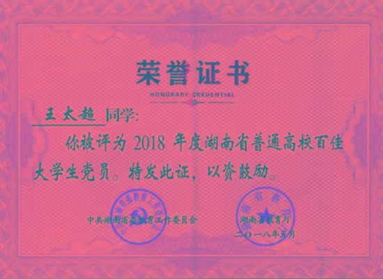 近日,从湖南省委教育工作委员会、湖南省教育厅下发的《关于表彰湖南省普通高校百佳大学生党员的通报》(湘教工委通〔2018〕22号)中获悉,我校学生党员王太超获得“湖南省普通高校百佳大学生党员”荣誉称号。