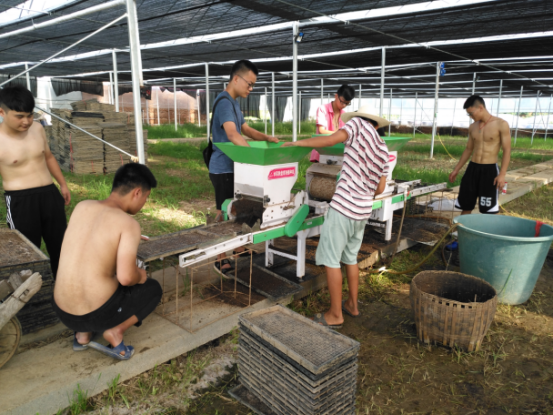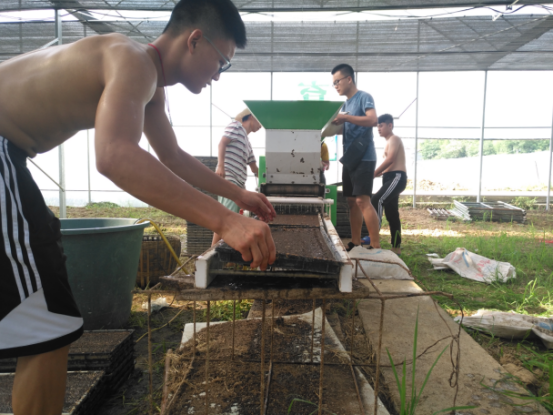 在杂草处理完后,在朱冬老师和合作社的负责人指导下,通过简短的分工后,我们操作着水稻秧盘育秧机进行着播种育苗,这机器的轰鸣声中队员们投入到了劳动中。大棚里的温度很高,队员就把衣服都脱了,即使队员们汗流浃背但是无论多高的温度都阻止不他们热情高涨。直到太阳渐渐落山之后,才将已经完成好育秧的放在一起盖上,离开了大棚