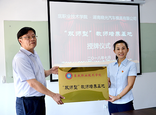 7月16日,在我校副校长颜彩飞带领下,人事处处长申晓伟、机电工程学院院长陈育新、机电工程学院副院长罗正斌等一行,来到湖南晓光汽车模具有限公司,在该公司进行“‘双师型’教师培养基地”授牌。授牌仪式在晓光模具工匠学院举行,公司副总经理、工匠学院院长杜俊鸿,公司副总经理唐亚明,工匠学院副院长刘鹏出席。仪式由刘鹏主持。