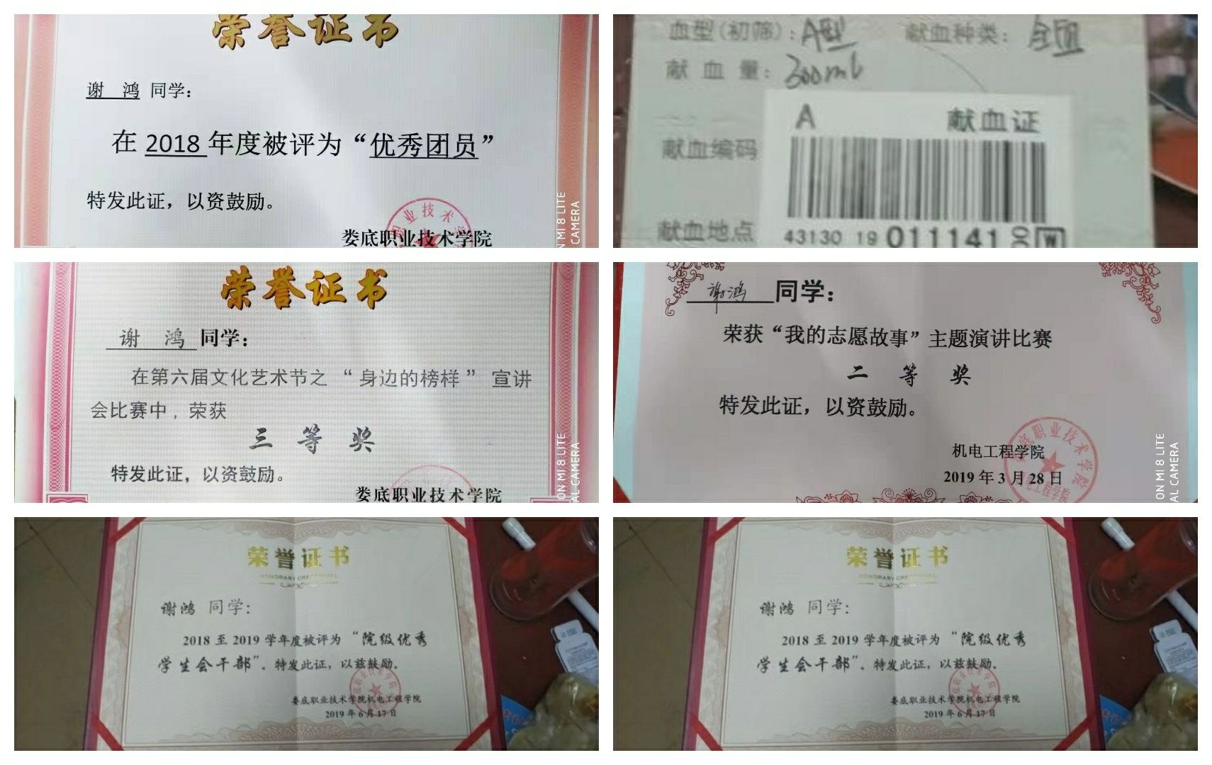 谢鸿获得的证书